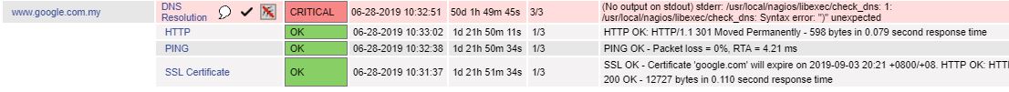 While I notice that check_dns was not been compile by default, I follow https://support.nagios.com/forum/viewtopic.php?f=7&t=11660 to make check_dns again from source but there is some error come out. And also cannot find [char NSLOOKUP_COMMAND = "/usr/bin/nslookup";] in check_dns.c. r...