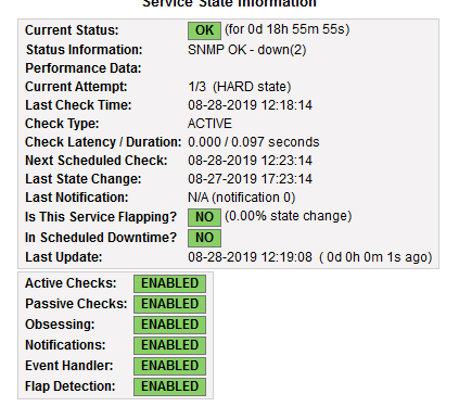 check_command check_snmp!-C public -o ifOperStatus.6 -r 1https://assets.nagios.com/downloads/nag ... uters.htmlIn the example above, the "-o ifOperStatus.1" refers to the OID for the operational status of port 1 on the switch. The "-r 1" option tells the check_snmp plugin to return an OK state if "1" is found in the SNMP result (1 indicates an "up" state on the port) and CRITICAL if it isn't found. The "-m RFC1213-MIB" is optional and tells the check_snmp plugin to only load the "RFC1213-MIB" instead of every single MIB that's installed on your system, which can help speed things up.