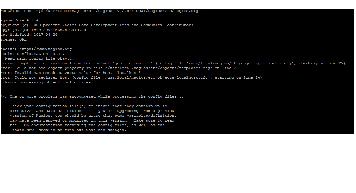 After I ran the said command below my nagios was not running now and got these error, please see. Thanks