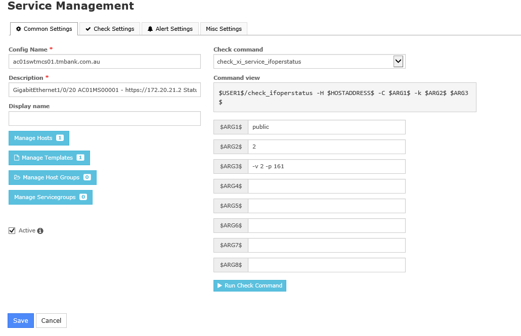 In GUI, the service definition(.png) and "Run Check Command" output (.pdf) are in the attachments. Please do let me know if there is any further info I can provide.