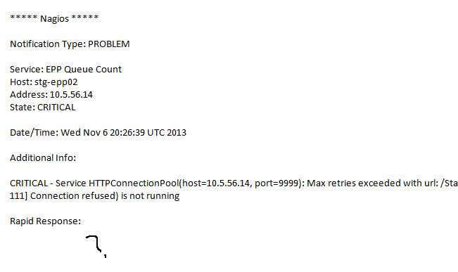 /usr/bin/printf "%b" "***** Nagios Monitor XI Alert *****\n\nNotification Type: $NOTIFICATIONTYPE$\n\nService: $SERVICEDESC$\nHost: $HOSTALIAS$\nAddress: $HOSTADDRESS$\nState: $SERVICESTATE$\n\nDate/Time: $LONGDATETIME$\n\nAdditional Info:\n\n$SERVICEOUTPUT$\n\nRapid Response:\n$$(echo "http://10.5.56.62/nagios/cgi-bin/extinfo.cgi?type=2&host=$HOSTNAME$&service=$SERVICEDESC$" | sed 's/ /%20/g')" | /bin/mail -s "** $NOTIFICATIONTYPE$ Service Alert: $HOSTALIAS$/$SERVICEDESC$ is $SERVICESTATE$ **" <your email>