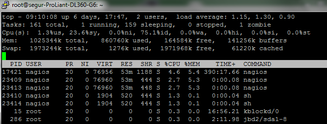 When I restart Nagios, memory goes from 164KB free to 262kB free, but at the begining my system had 500KB free. Day by day my memory continues reducing my free memory. I attach two snapshot, one before de restart Nagios, and the other after restart Nagios.