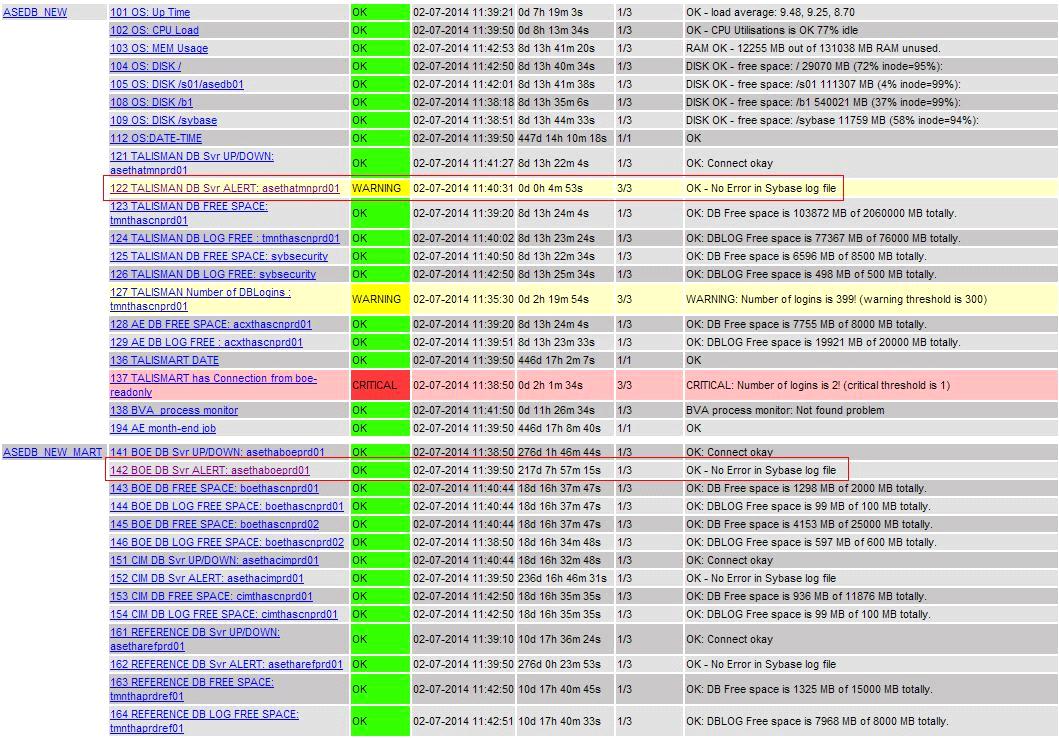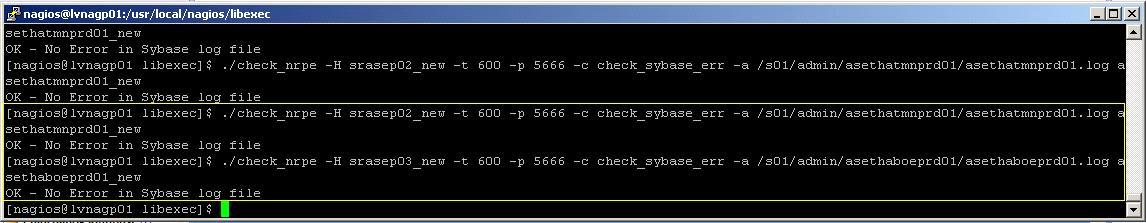 According to our nagios system was implement for check some sybase sybase server health with "nrpe" for call shell script to get the log file from sybase database to seek "error" wording on log and return to nagios status ("OK", "Warning", "Critical") on Web GUI. This our technique that we use for monitor almost 8 months ago.