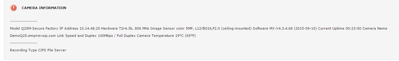 #CAMINFO=$(cat /tmp/$FILENAME.txt | grep -e "Model" -e "Factory IP Address" -e "Hardware" -e "Image Sensor" -e "Software" -e "Current Uptime" -e "Camera Name" -e "Link Speed" | awk '!/Hardware Gains/' | awk -F '"' '{print $2, " - ", $4}' )