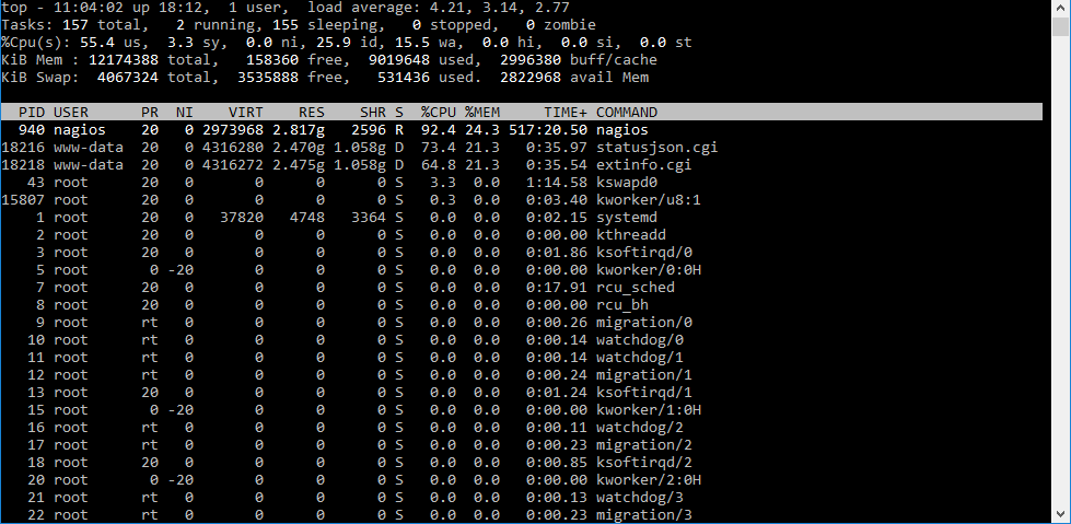 Thanks. That helped get Nagios running. I have attached screen shots of where we are now including performance stats. Response times are still pretty slow on the UI. I don't see nagios in the top results anymore. Looking at top, the CPU is mostly idle and swap memory isn't being used until you try to load a page on the UI. I had top running when I clicked on the Nagios Service Problems link on the left. It took 1m 15s to load the page. I attached a video in real time of the top running so you can see what is happening from that standpoint. Any ideas?