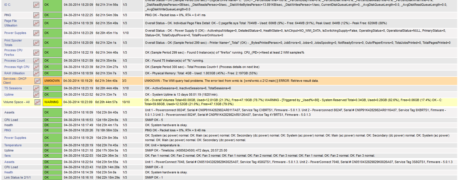 [1398870389] SERVICE ALERT: DEISMSW03;fans;OK;HARD;3;OK: fan1 unit1 normal. OK: fan2 unit1 normal. OK: fan1 unit2 normal. OK: fan2 unit2 normal. OK: fan1 unit3 normal. OK: fan2 unit3 normal. OK: fan1 unit4 normal. OK: fan2 unit4 normal.