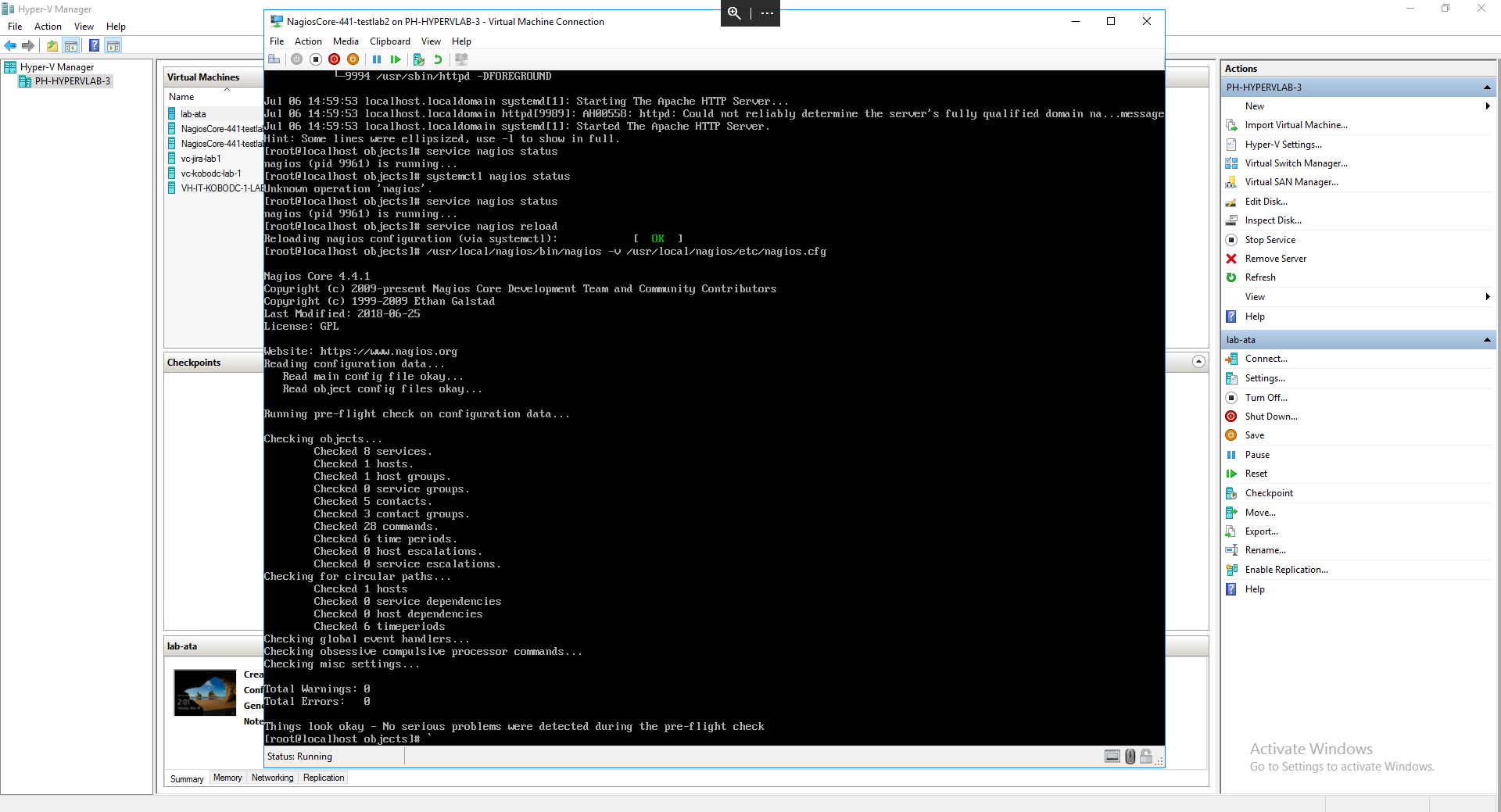 I actually worked through all the errors today and ran the config test. All looks good now (see screenshot). I was even able to reload the nagios config and start the service. However, i'm no longer able to reach the web console after logging in. I confirmed the Apache HTTP server and service is running. Any ideas to help resolve? See second screenshot for error.