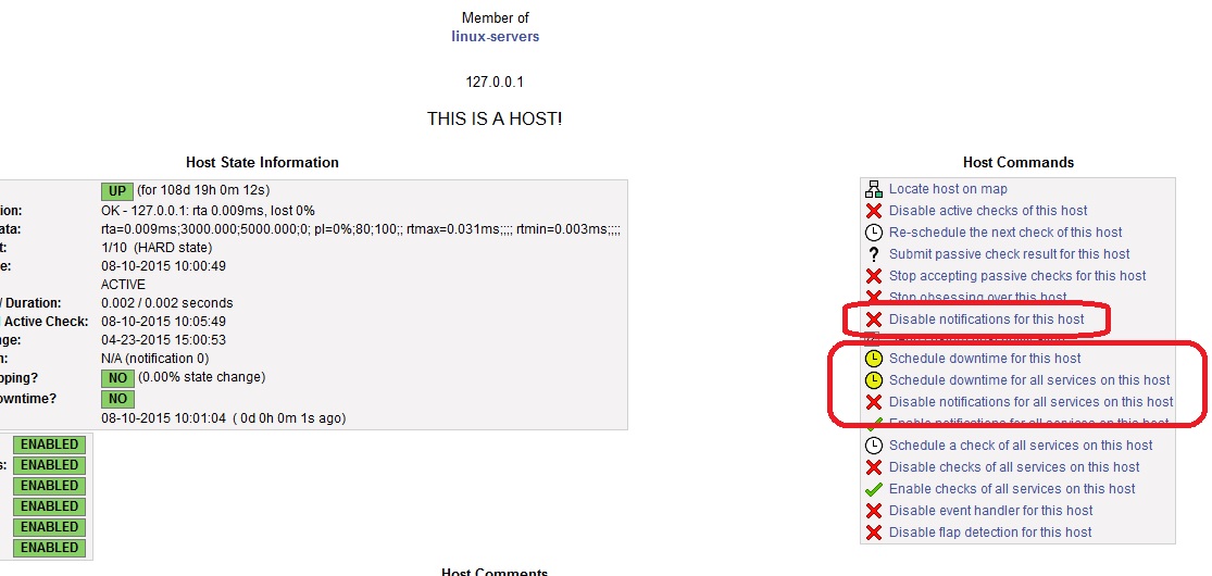 Have you tried scheduling downtime for the host or have you clicked the disable notifications on the host? Are you getting any errors when doing that?