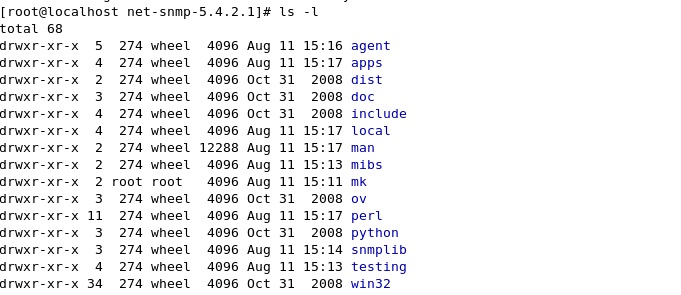 Can you please provide the output of an ls -l command in the net-snmp directory inside of code brackets?