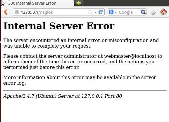 I have a problem in my apache server when I try to open nagios. Apache works correctly. But when I put http://localhost/nagios the web give me this message [img] (image attached).