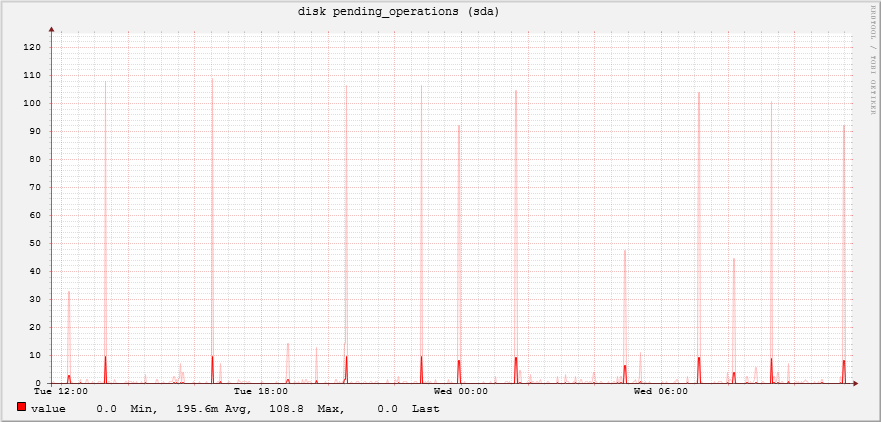 Also, I see the graph attach (disk pending operations) that have frequently disk access. Is possibile that is combine with the load peak?Do you the reason of this disk access about nagios?