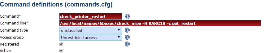 * In NagioSQL I have a check command called "Check_Printer_Restart" ( /usr/local/nagios/libexec/check_nrpe -H $ARG1$ -c get_restart)