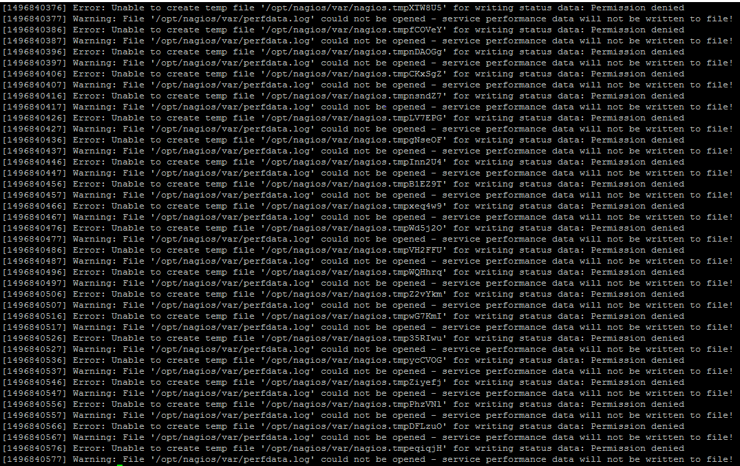 When I connect to the Nagios interface I have "Nagios Not Running" and looking at the logs I have the following message (Screenshot), while the file "var" have all permission
