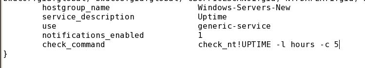 check_nt!UPTIME!-l hours -c 5So you should be able to test this from the command line running (replacing IP_ADDRESS with a real IP