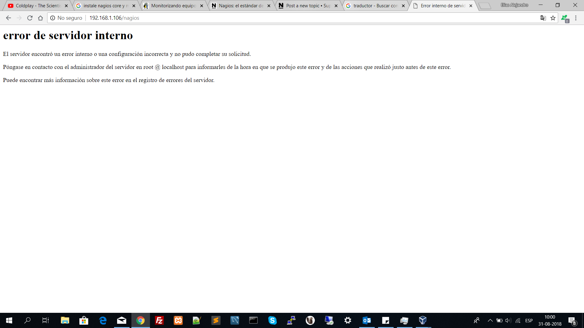 Good, have a cordial greetings, yesterday install nagios core 4.4.3 and nagios-plugins, create the user and with your password, I gave the folder permission and it tells me that I have an internal server error.