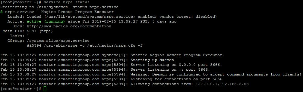 also, when I enter service nrpe status I get output active running, and get a warning that Daemon is configured to accept command arguments from clients. I'll attach pic so you can see.