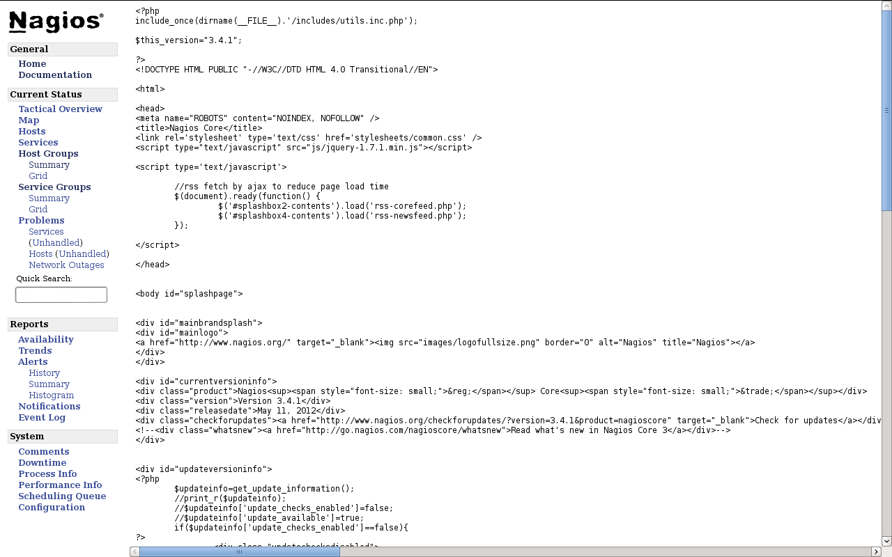 It looks like you don't have PHP installed... or your web server isn't serving PHP pages properly. I don't think this is a Nagios specific problem, maybe write a quick hello world PHP page to test that it will actually serve PHP at all?