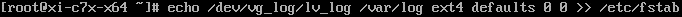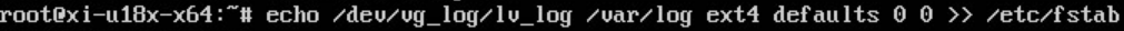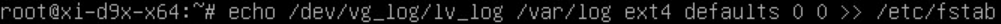 echo /dev/vg_log/lv_log /var/log ext4 defaults 0 0 >> /etc/fstab