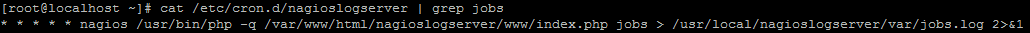 The jobs subsystem starts every minute via a cron located at /etc/cron.d/nagioslogserver and runs as the nagios user: