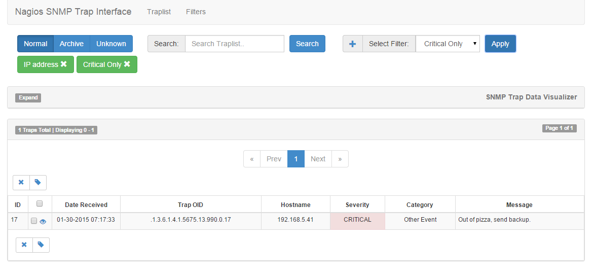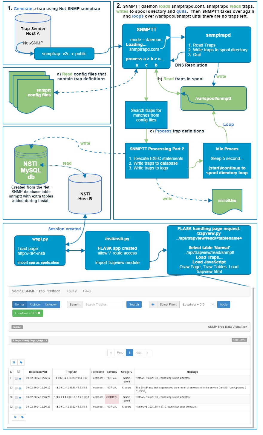 This Article will outline and describe how Nagios SNMP Trap Interface works from the ground up. Details describe how SNMP traps are accepted in the backend, displayed in the User Interface, written to the database, and more. Much of the focus of this article will be on the back end handling and writing of traps using Python. This guide applies to NSTI version 3.0.2 or newer.