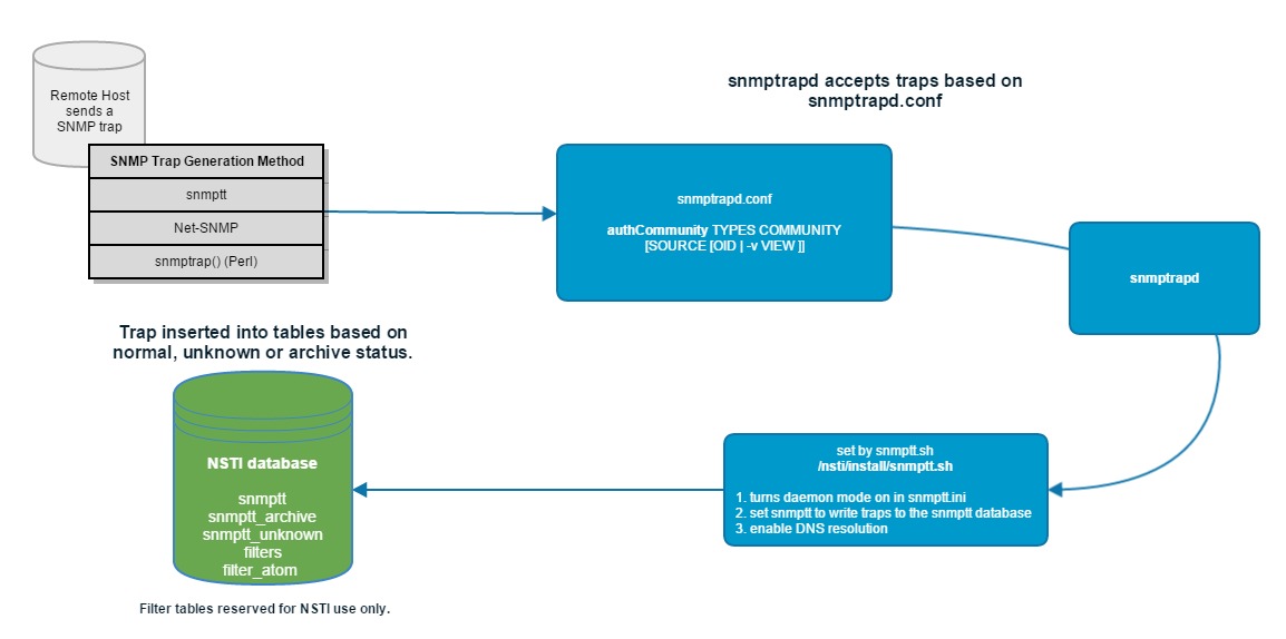 Here is the basic workflow of a Trap going into the NSTI host and being handled and written to the database where it is read and displayed by NSTI: